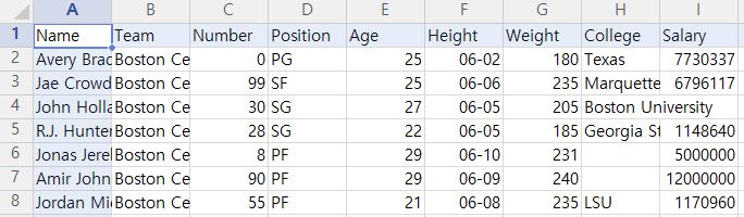 원래의 자료는 Name,Team,Number,Position,Age 등등 열이 많습니다.
