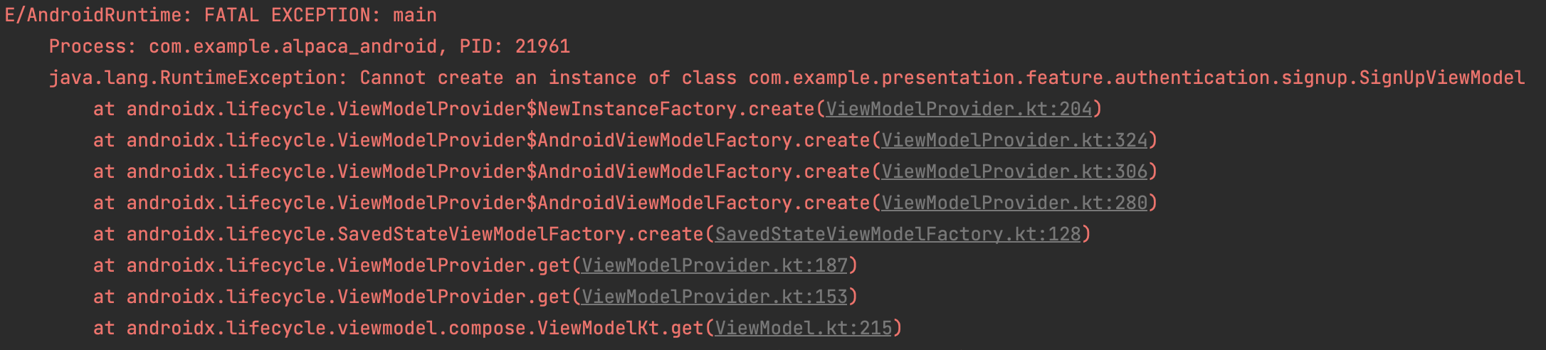 기본적으로 뷰모델 생성시에 useCase같은 것을 inject한다던지 무언가를 전달 할 때에는 위 같은 런타임 에러가 발생합니다.