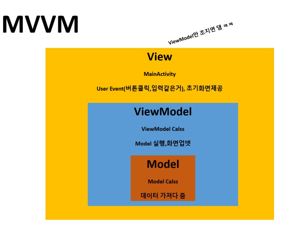 ViewModel은 View(MainActicity)가 MVC에서 하던 데이터와 화면업데이트를 대신 해주게 됩니다. (MVC와 차이점)